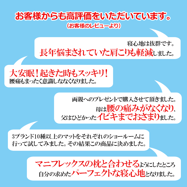 メッシュウイングよりソフトな寝心地だから、女性ややせ気味の 方でも硬く感じずに最初から違和感なく寝られます。