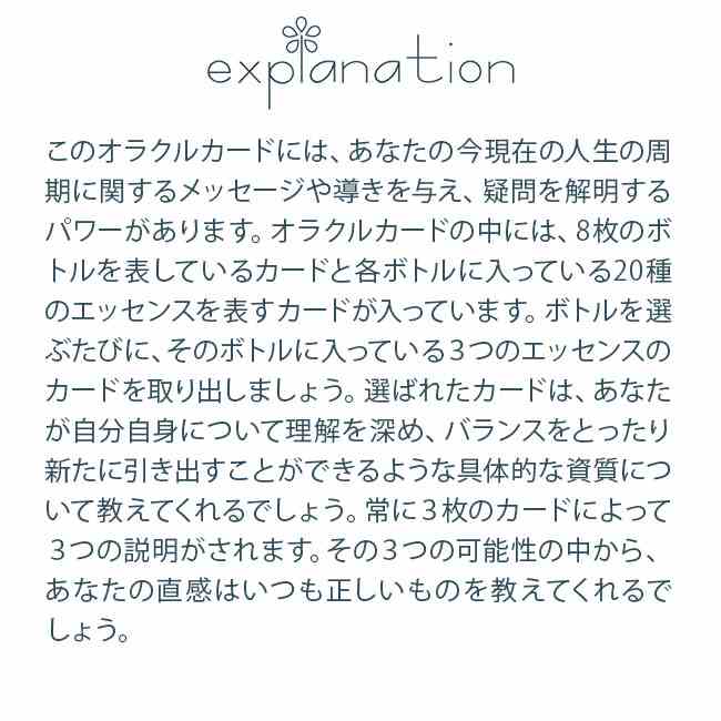 オラクルカードの中には、8枚のボトルを表しているカードと各ボトルに入っている20種のエッセンスを表すカードが入っています。