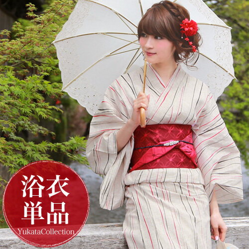 【浴衣単品】「生成り地に赤よろけ縞」【あす楽】 浴衣 クリーム 白 縞