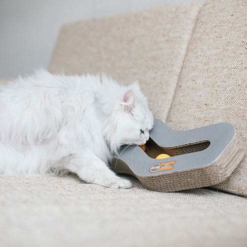 コロコロ転がる2つのボールと爪とぎが一緒になった猫ちゃんの遊び心をくすぐるダンボールトイ。