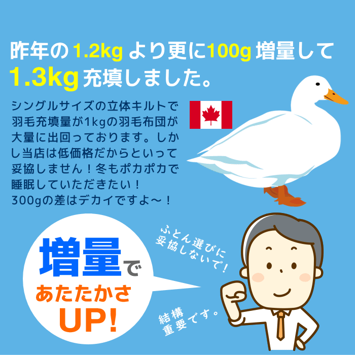 [最大2,000円クーポン]使用可 シングル 羽毛布団 カナダ産ホワイトダックダウン 85% 1.3kg入 SL 150×210cm 日本製 工場直販 国内洗浄 シングルロングサイズ DP350以上 エクセルゴールドラベル付 TTC生地