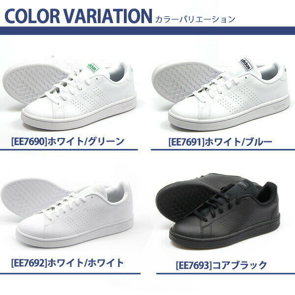 有料ラッピング対応■商品詳細 ■ブランド adidas アディダス ■商品名/品番 ADVANCOURT BASE EE7690 EE7691 EE7692 EE7693 アドヴァンコート ベース EE7690 EE7691 EE7692 EE7693 ■カラー [EE7690]ホワイト/グリーン 白色/緑色 [EE7691]ホワイト/ブルー 白色/紺色 ※ブルーはネイビーに近いお色です [EE7692]ホワイト/ホワイト 白色/白色 [EE7693]コアブラック 黒色 ■取扱いサイズ 23cm 23.5cm 24cm 24.5cm 25cm 25.5cm 26cm 26.5cm 27cm 28cm 29cm ■素材 《アッパー》合成皮革 《アウトソール》ゴム底 ■ワイズ(横幅) 標準的な2E(EE)相当 ■靴の詳細 (23.5cm採寸) 《ソール高》接地面より約 3.0 cm 《履き口までの高さ》約 9.5 cm(ソール部分も含む) 《履き口周り》紐を結んで調節出来ます 《重量》片足 約 291 g ■サイズについて こちらの商品は【標準サイズ】です。