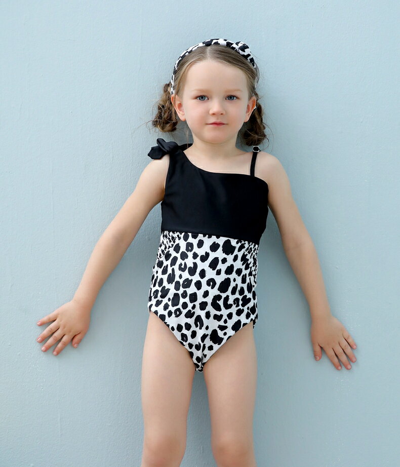 送料無料 子供用水着 ワンピースタイプ カチューシャ付き 2点セット アシンメトリ— スイムウェア キッズ 女の子 ガールズ 女子 肩リボン 切り替え ヒョウ柄 豹柄 海水浴 プール ビーチ 水遊び リゾート 夏 かわいい 可愛い 女児 子ども用 こども